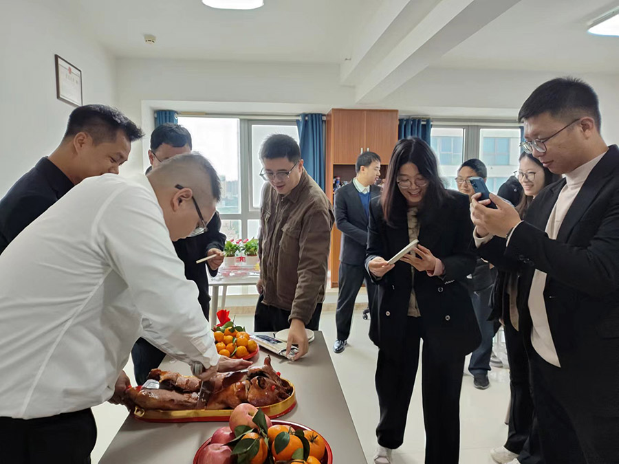讲话结束后,最激动人心的切烧猪庆祝活动开始了。一头烧得香脆的烧猪被抬了进来,领导们亲自切开烧猪,分给每一位员工。大家一边品尝美味,一边互相祝福,现场充满了欢声笑语。随后,同事们在新办公室里自由活动,有的熟悉新工位,有的在休闲区聊天,还有的组织了小游戏,大家都对新环境赞不绝口。